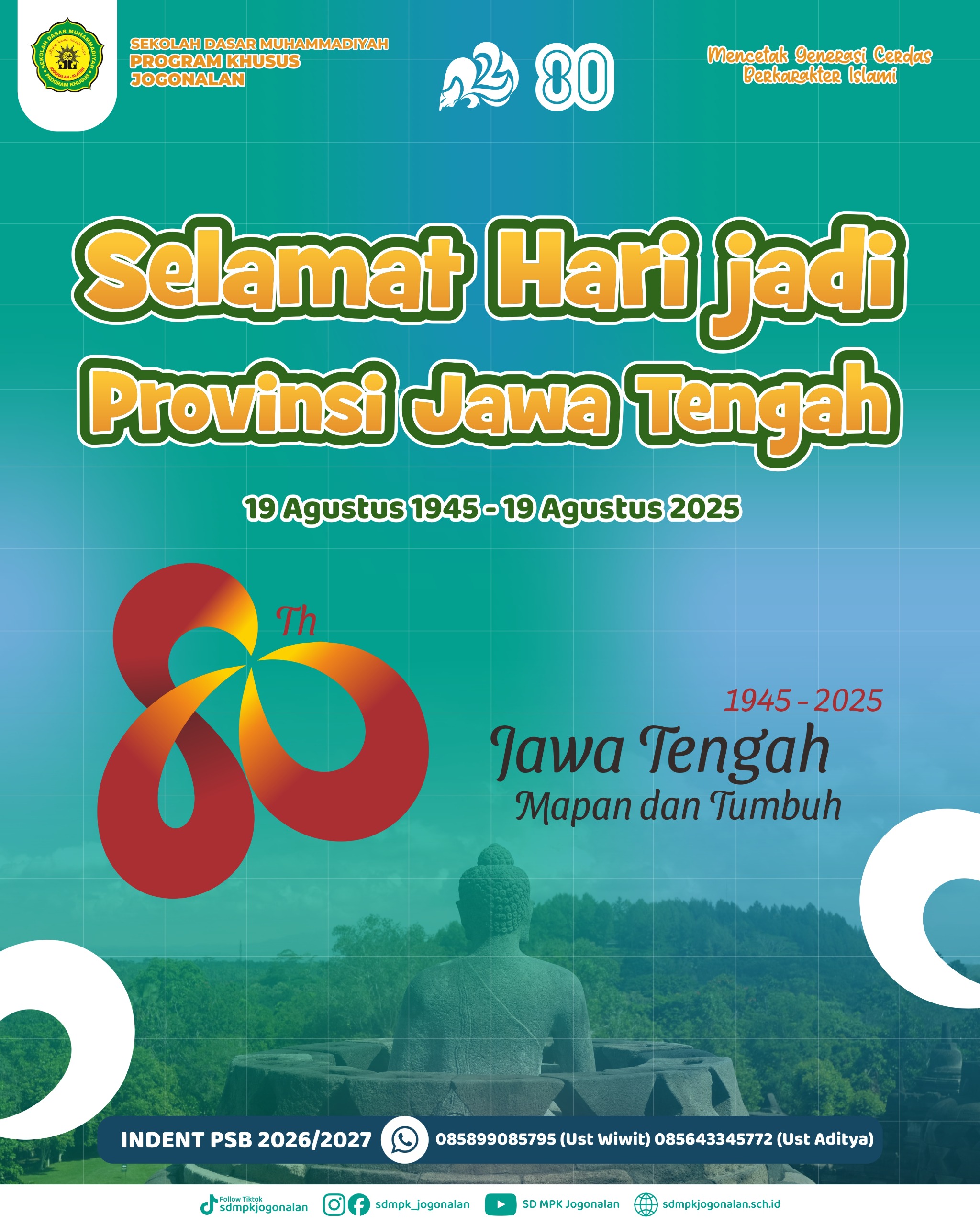 SD Muhammadiyah Program Khusus Jogonalan mengucapkan Selamat Hari Jadi Provinsi Jawa Tengah yang ke-80.
